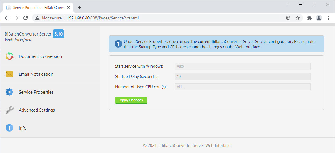 NOTE: Under Service Properties, one can see the current BiBatchConverter Server Service configuration. Please note that the Startup Type and CPU cores cannot be changed on the Web Interface.