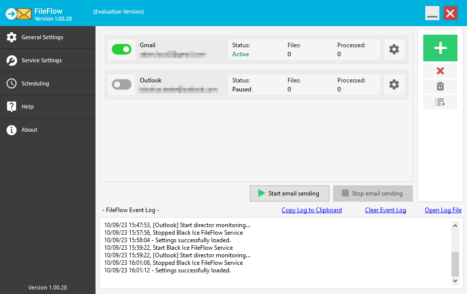 To add email accounts for email sending and folder monitoring, and configure email settings, please click on the Add