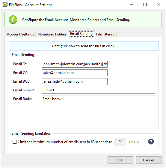 On the Email Sending tab, the predefined recipients, subject, and email body can be configured.