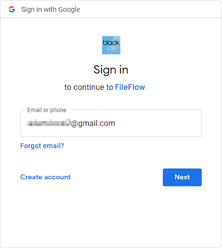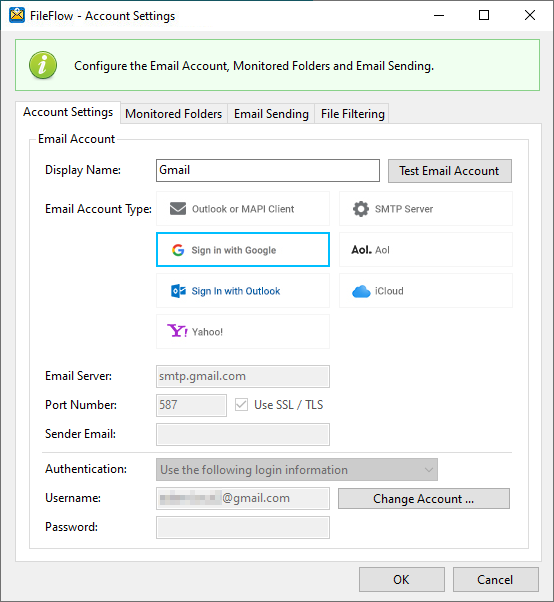 To configure the FileFlow to use Gmail for email sending, please click on the Sign in with Google option on the Account Settings window.