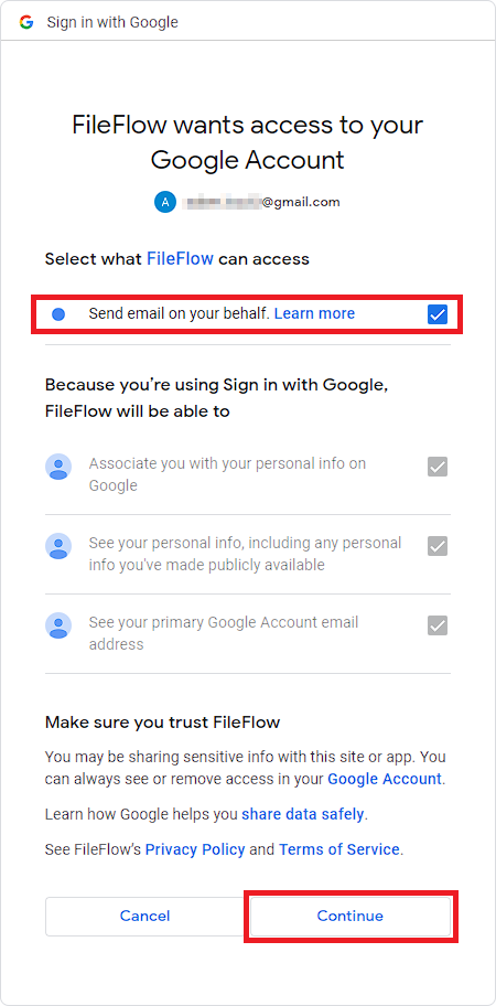 After signing in, please enable the See and download your contacts and the Send email on your behalf options (or check the Select all option) on the appearing page and click on the Continue button.