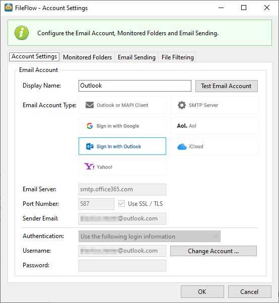 To configure the FileFlow to use Outlook for email sending, please click on the Sign in with Outlook option on the Account Settings window.