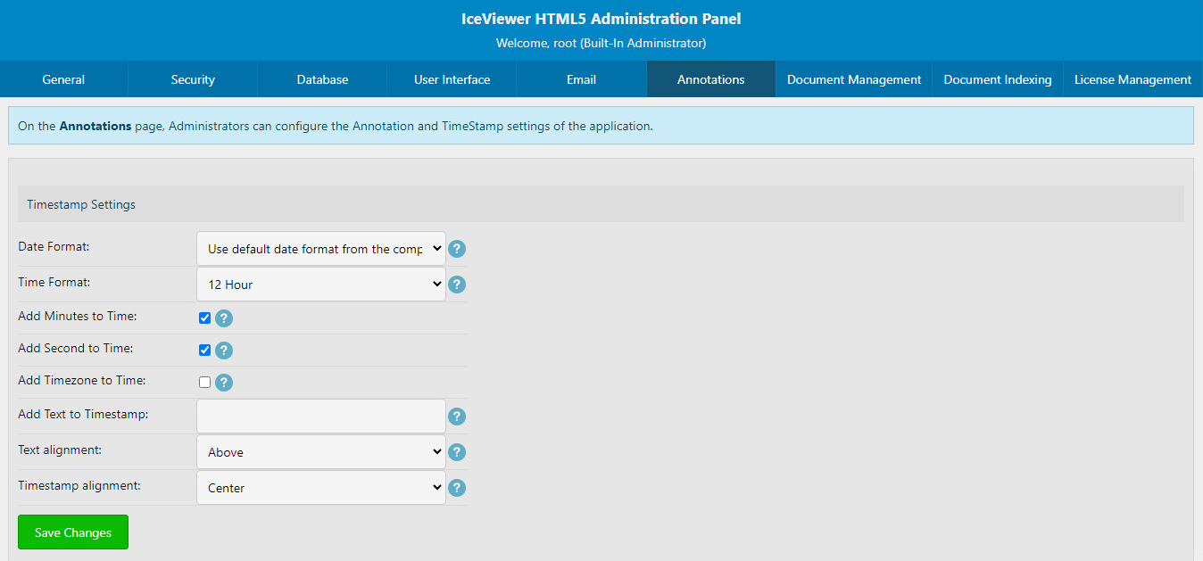 Under Annotation Settings, Administrators can configure the timestamp annotation format and settings.