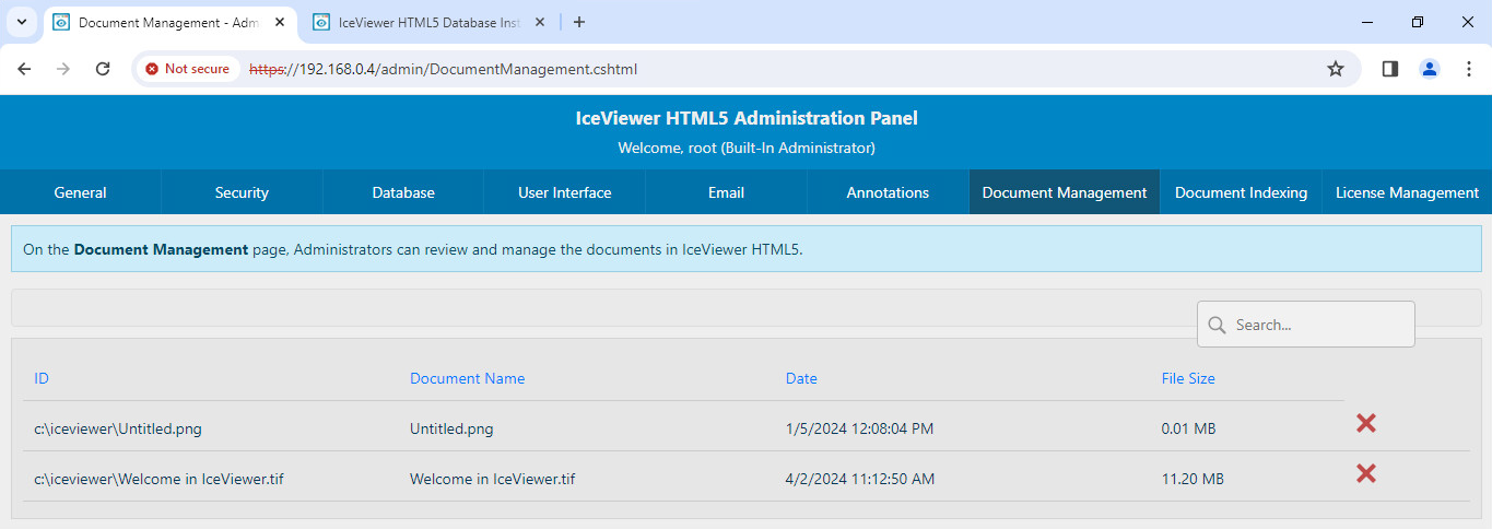 Administrators can sort the document list based on any displayed attribute by clicking on the column name, and also can delete specific documents by clicking on the delete icon on the right side of the row.
