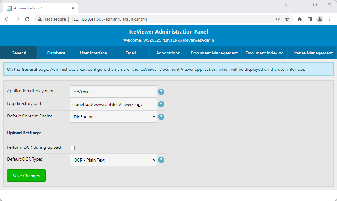 Under General Settings, Administrators can configure the displayed name of IceViewer HTML5, and the default Content-Engine the IceViewer HTML5 should use for loading and saving documents.