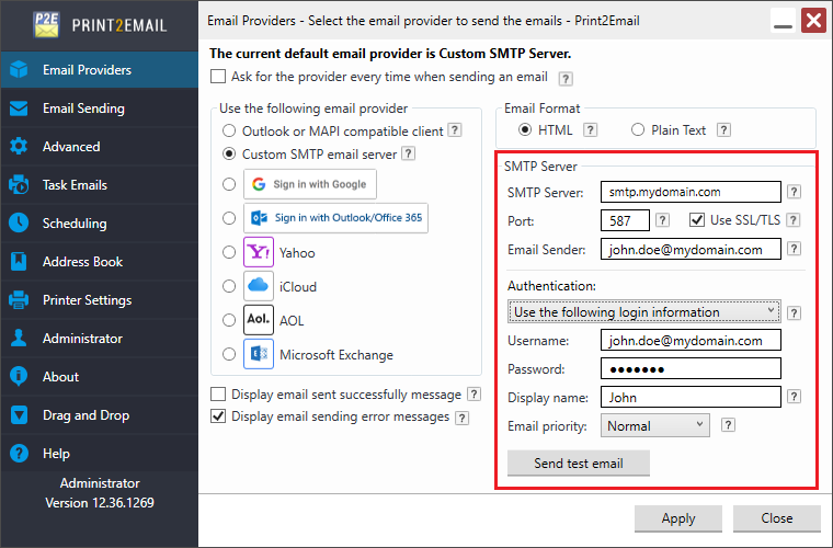 Refer to your SMTP server’s documentation for the correct configuration settings. Enable Using SSL/TLS if the server requires encrypted communication (e.g., Gmail, Yahoo). Print2Email currently supports TLS encryption on port 587.