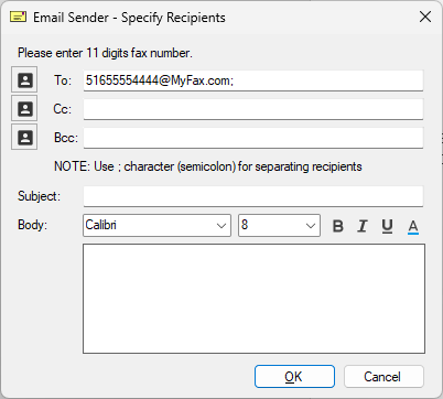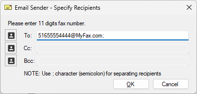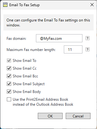 The simplified user interface can be further limited to only use the To: field by unchecking the Show Email Cc: and the Show Email Bcc: checkboxes on the Email to Fax Setup window, as shown in the example below: