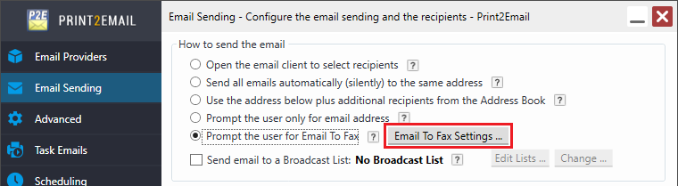 To configure the Email to Fax email sender window, please navigate to the Email Sending tab, make sure the Prompt the user for Email to Fax option is enabled, and click the Email to Fax Settings button.