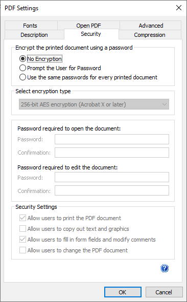 The PDF Security features of the Print2Email Printer Driver allow the following actions: