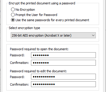If the Use the same passwords for every printed document option is selected, the user can provide passwords for different access levels on the Security tab, which will be used for every printed document.