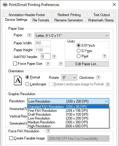 If the Create faxable image is checked, the printer driver forces a fax optimized resolution. The paper sizes and graphic resolutions are not restricted, but the end result image file has a faxable page size and fax-compatible resolution. For example, if the page is Letter paper size and 600 DPI, the generated file width is set to 1728 pixels.