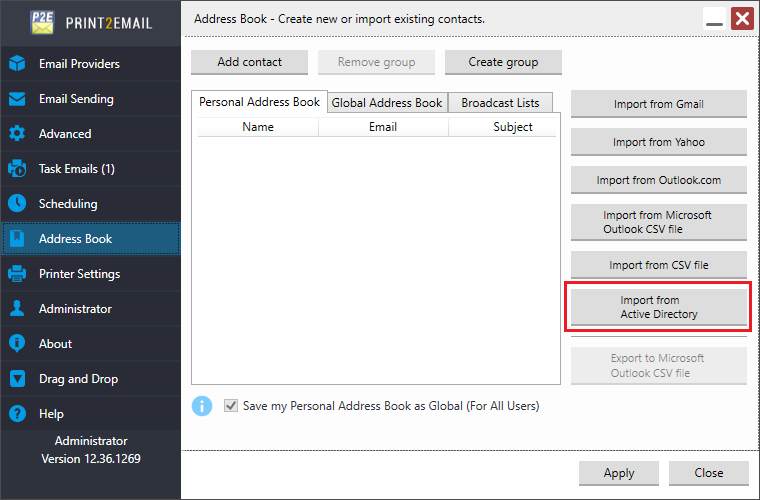 To import contacts from the Active Directory, click on the Import from Active Directory button.