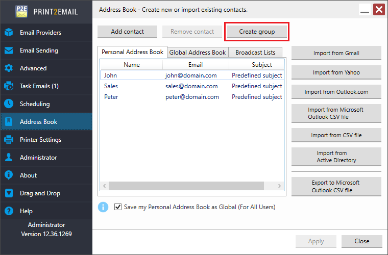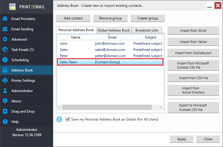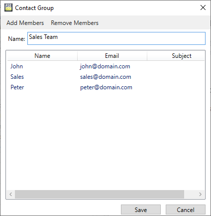 One can group existing contacts and email addresses into Contact Groups in Print2Email. Contact Groups are very useful for sending emails to a large number of recipients. By using the Contact Groups, users don’t have to specify the recipients every time when sending an email; simply select the contact group.