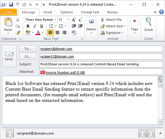 EB set up the email body to Black Ice Software has released Print2Email version 9.24 which includes new Content Base Email Sending feature to extract specific information from the printed documents, (for example email subject) and Print2Email will send the email based on the extracted information.