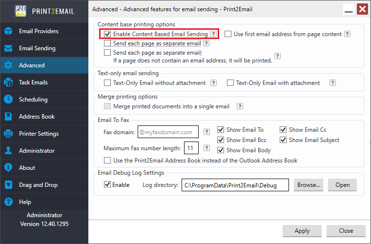 To enable the Content Based Email Sending feature, start the Print2Email, go to the Advanced tab and check the ‘Enable Content Based Email Sending’ option.