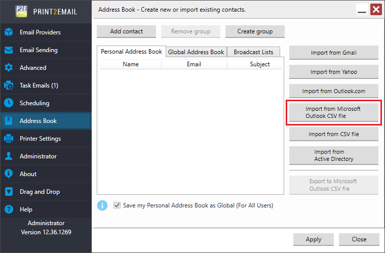 - Open the Address Book of Print2Email and click "Import from Microsoft Outlook CSV" file.