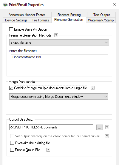 In this edit box the user can specify the path where the driver saves the generated output files. Make sure that the printer driver has the appropriate permissions to create the files in the directory.