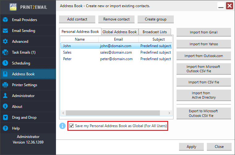 Only Administrators can save their Personal Address Book as Global Address Book. In order to save your Personal Address Book as Global, please make sure that the Print2Email is running by as Administrator, enable the Save My Personal Address Book as Global (For All Users) option, and click on the Apply button.