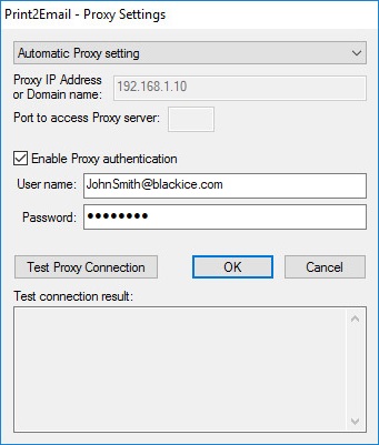 SOCKS Proxy - Select SOCKS proxy from the drop down list to configure the Proxy IP address and port number manually. SOCKS proxy servers establish a TCP connection to licenseserver.blackice.com and forward TCP messages from the Black Ice Print2Email during registration and license validation.