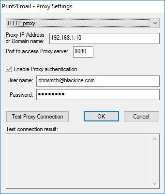 HTTP Proxy - Select HTTP proxy from the drop down list to configure the HTTP Proxy IP Address and port number manually. The HTTP proxy server receives HTTP requests from the Black Ice Print2Email during registration and license validation and then forwards the requests to licenseserver.blackice.com.