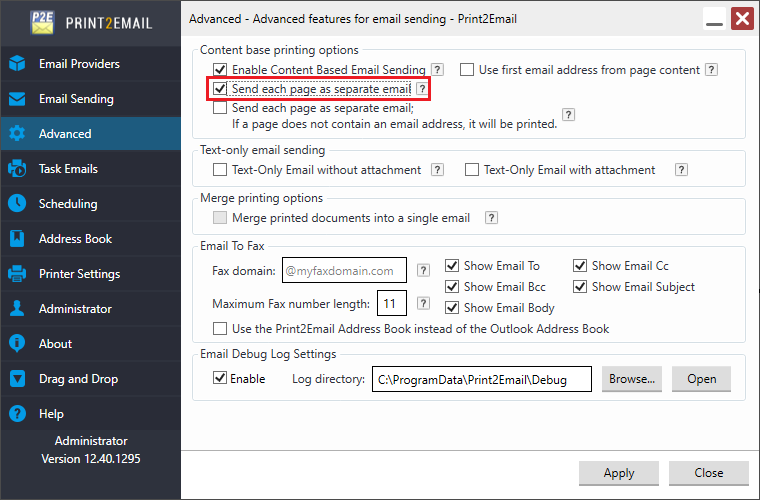 NOTE: Send each page as separate email option can only be used, if the ‘Enable Content Based Email Sending’ option and/or the ‘Use first email address from page content’ option is checked.