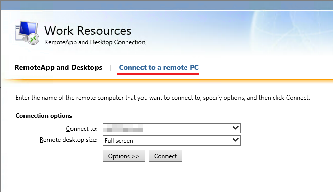 · Connect to RD Web Access with the Connect to a remote PC option: