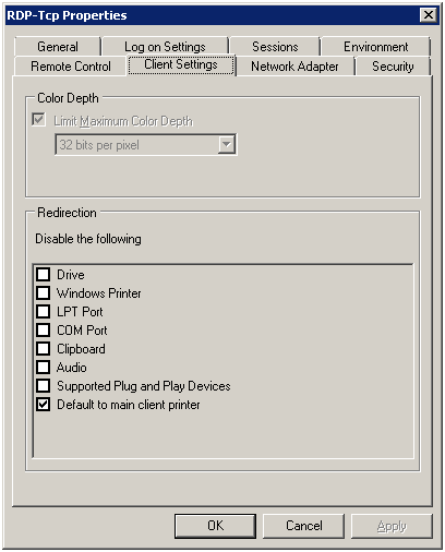 4. Click the Client Settings tab in the RDP-Tcp Properties dialog and make sure the checkbox for Default to main client printer is checked.