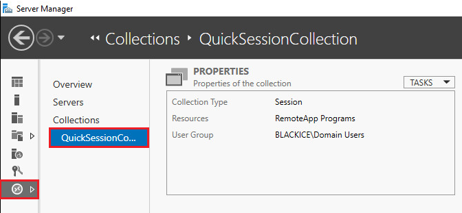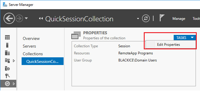 Open the Server Manager > and click on the Remote Desktop Services icon on the left menu and select the Session Collection you would like to configure.