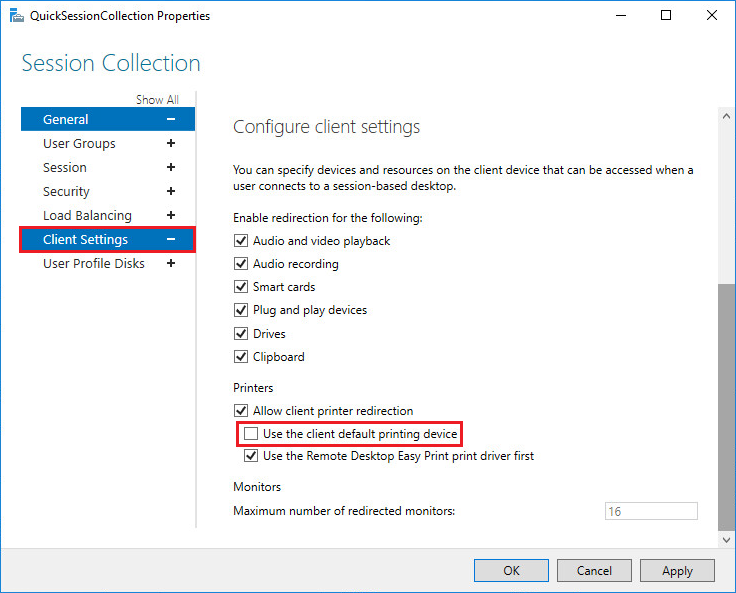 Once the Remote Desktop Service Role is deployed, the Default Printer can be set up.