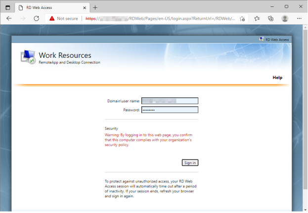 2. Enter the user name and password to log in to the RD Web Access Web site.