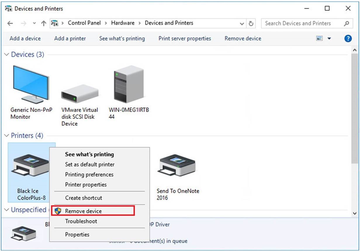 Open Control Panel -> Devices and Printers and select the stuck printer you would like to remove.
