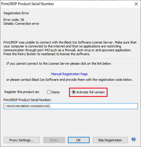 Please select the Activate full version option, enter the serial number in the Print2RDP Product Serial Number field and press OK. The serial number can be found in the body of the email containing the download instructions for the Print2RDP.