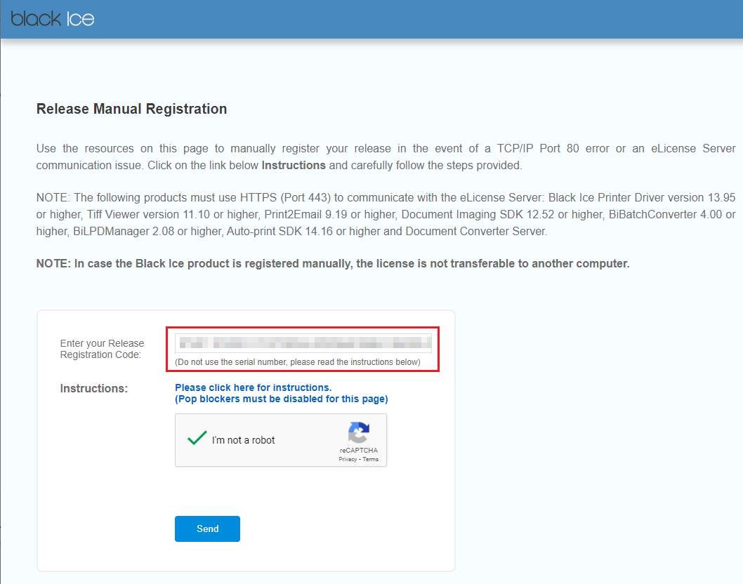 To receive a Release License Number immediately, please copy the Release Registration Number from the installer window to the Enter your Release Registration Code field on the Release Manual Registration webpage as shown below.