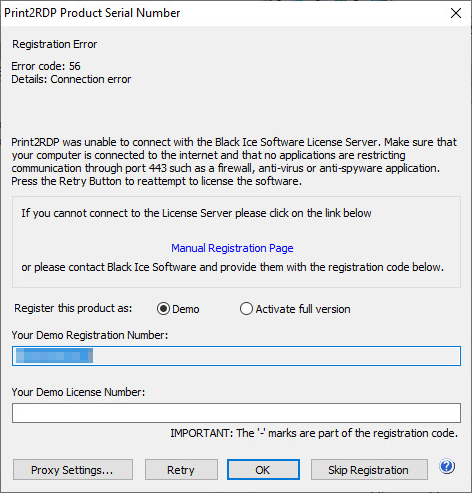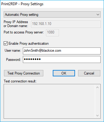 SOCKS Proxy - Select SOCKS proxy from the drop down list to configure the Proxy IP address and port number manually. SOCKS proxy servers establish a TCP connection to licenseserver.blackice.com and forward TCP messages from the Black Ice Print2RDP during registration and license validation.