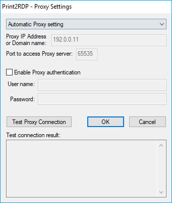 If the Proxy server is using user authentication, the Proxy authentication checkbox must be checked and the User name and Password must be specified.
