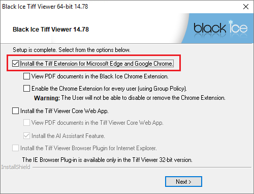 To install the TIFF Viewer without the Chrome / Edge extension, please turn off the “Install the Tiff Extension for Microsoft Edge and Google Chrome” option during the interactive installer: