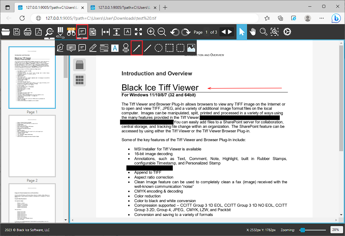 To add an Arrow Annotation to the document, please click on the Annotations icon on the top toolbar, select the Arrow Annotation option from the dropdown menu and draw the annotation on the page by clicking and holding down the left mouse button while moving the cursor.
