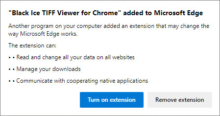 Microsoft Edge shows the following message on the first startup after installing the Tiff Viewer:
