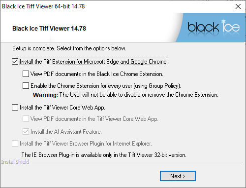 6. On the next window, users can choose to install the Browser Extension for Google Chrome or Microsoft Edge, the TIFF Viewer Core, or the Browser Plugin for Internet Explorer.