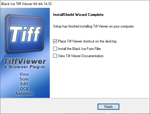 7. On the next window, users can choose to create a desktop shortcut for TIFF Viewer, install the Black Ice Form Filler, or view the TIFF Viewer documentation after the installation has finished.
