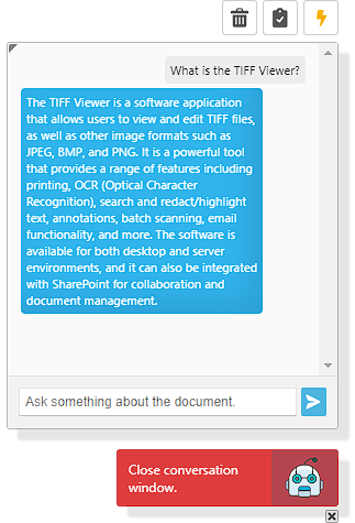 The AI Assistant provides the ability for users to ask questions about the opened document in the TIFF Viewer Core, whether it is a medical record, a legal document, or technical documentation. The virtual assistant is an Open AI ChatGPT-powered feature, that enables users to navigate through and extract information quickly from documents.
