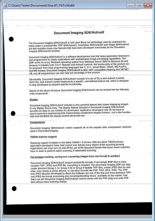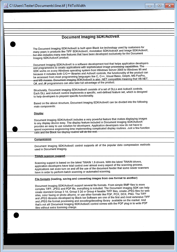 The Line Removal is used with faxed or scanned documents. Faxed documents often contain annoying horizontal lines due to communication noise on the telephone line. By utilizing the Line Removal functionality of Tiff Viewer, these lines can automatically be removed from faxed documents. Scanned documents in some cases, also have horizontal or vertical lines due to the banding or folding of papers.