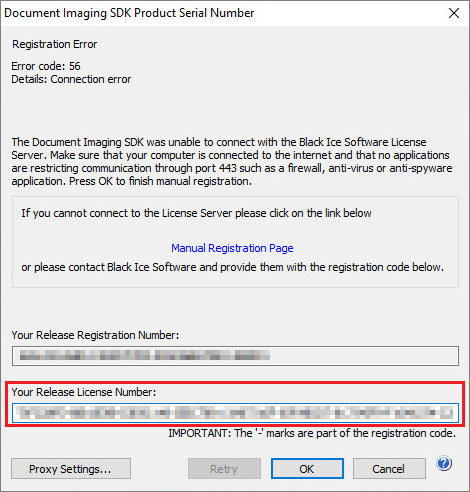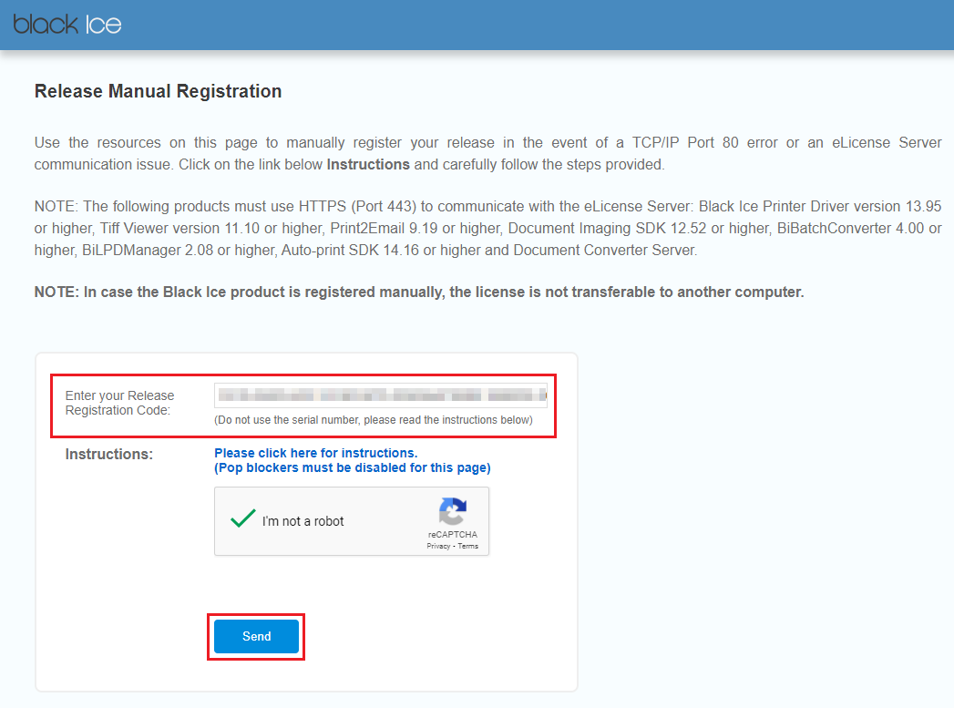 In a secured environment where the port 443 cannot be enabled, the software can be manually registered online. To receive a release license number immediately, please copy the release registration number from the installer window to the ‘Enter your Release Registration Code’ field on the Release Manual Registration webpage as shown below.