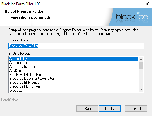 The program folder can be left as it is by default, can be typed in, or can be chosen from existing ones.
