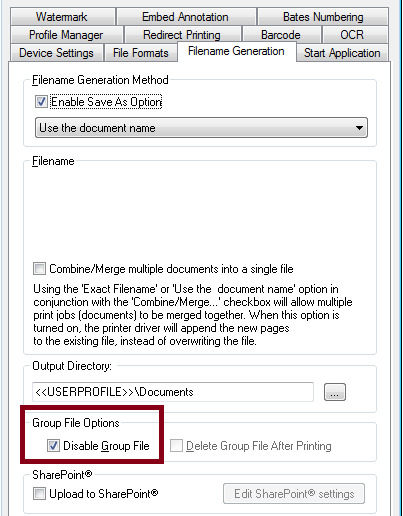 To disable group file generation in the Black Ice Printer Drivers, go to the Control Panel > Printers and Devices > right click on the Black Ice Printer Driver > Printing Preferences… > Filename Generation and make sure the Disable Group File option is checked.