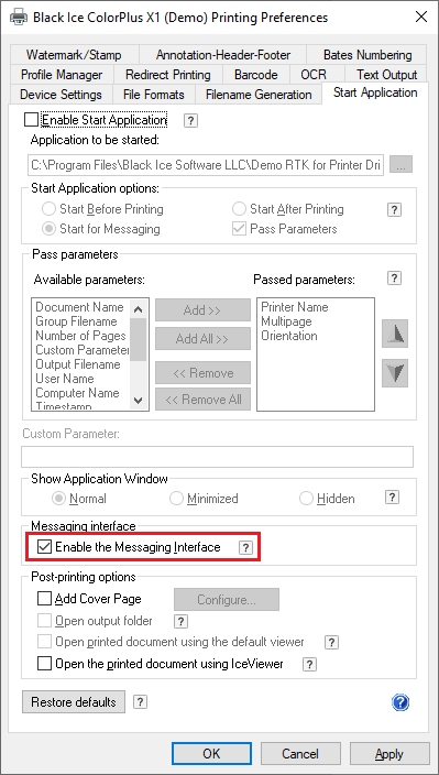 Make sure that the Messaging Interface is enabled in the Printer Driver Printing Preferences > Start Application tab: