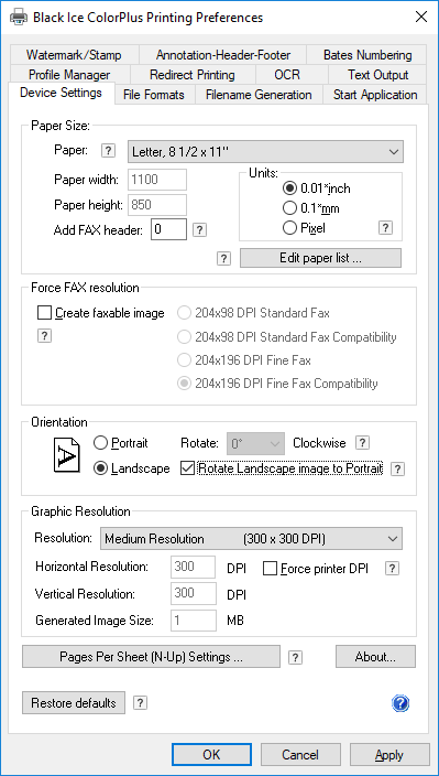 When landscape mode is selected, this rotates the generated landscape image 90 degrees so it can be printed. Also, this option is selected automatically when the Create Faxable Image setting is checked.