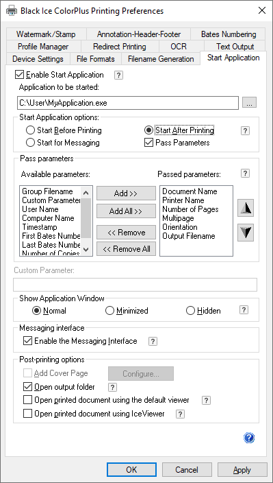 By default the printer driver messaging interface is disabled. To activate the printer driver Messaging Interface, navigate to the “Start Application” Tab of the printer driver and check the “Enable Messaging Interface” and enable/select the “Start for Messaging” option. The Messaging Interface can be configured through the Configuring the Drivers for Users by System Administrators section of the manual. The Start Application and the Messaging Interface can be configured through the .INI file during installation.