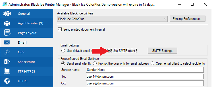 On this tab choose whether to use the default email client for email sending, or connect to an SMTP server. If the user chooses the Use SMTP client option, the SMTP Settings button appears. By clicking on it, the SMTP settings can be configured under the SMTP Settings tab.