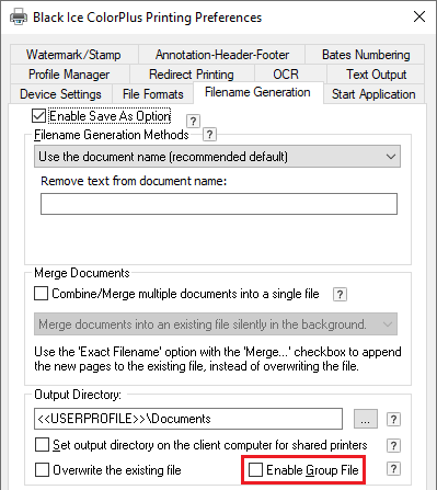 To disable group file generation in the Black Ice Printer Drivers, go to the Control Panel > Printers and Devices > right click on the Black Ice Printer Driver > Printing Preferences… > Filename Generation and make sure the Enable Group File option is unchecked.